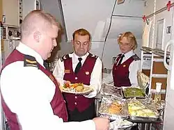 Staff prepare meals for Queen Elizabeth II and Prince Philip, Duke of Edinburgh, aboard a Canadian Forces Air Command CC-150 Polaris Royal Flight, en route to the Queen's engagements for her Golden Jubilee in 2002