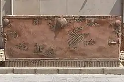 Fragments of granite sarcophagi were recovered from both inside and outside the Royal Tomb. Of these, Akhenaten's is the best understood. It was re-constructed from numerous fragments and is displayed at the Egyptian Museum in Cairo.[81] Made of red granite from Aswan,[82] it was 125.5 cm (49.4 in) wide and 288.5 cm (113.6 in) long.[83] It was rectangular, breaking with the usual cartouche-shape used for royal sarcophagi in the New Kingdom.[84] Its decoration featured the Aten instead of the traditional funerary gods; the protective goddesses on each corner of the box were replaced with figures of Nefertiti.[84] On the sloping lid, whose shape imitated the pr-wr shrine of Upper Egypt,[85] Aten rays reached along its length from the head end.[82]