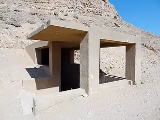 The Royal Tomb was cut in a small side valley off the main Royal Wadi, approximately 6 km (3.7 mi) from the valley's mouth and a further 4 km (2.5 mi) directly east of Amarna's central city.[1] It lies on the same axis as the Small Aten Temple.[40] The tomb was cut into the floor of the valley, facing approximately east[41] (actually southeast).[42] It descends back into the hillside for 53.245 m (174.69 ft).[43] Unlike previous royal Theban tombs, it has a straight axis. It is thought that this was intended to allow the sun's rays to shine all the way down into the burial chamber, something which does not work in practice. The layout of the main portion of the tomb is not substantially different to prior tombs. It was only cut as far as the first pillared hall which was adapted, through the removal of two pillars, into the burial chamber. The small, unfinished room in its north corner may be the start of the conventional bent axis.[44]