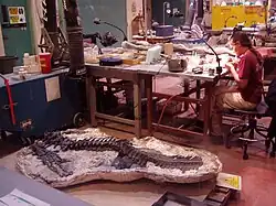 The museum research program has a broad mandate to document and analyze geological and palaeontological history, with reference to Alberta.[40] The museum's research program includes a palaeontological research group, as well as a rotating roster of postdoctoral fellows and graduate students.[10] Palaeontological technicians of the museum assist, or oversee fieldwork operations; as well as prepare fossils for exhibits, or research.[10] In 2015, the museum's group of palaeontological technicians had collectively over 150 years of cumulative experience.[10] Although formally not employed for the purposes of research, palaeontological technicians have performed independent, or collaborative research projects at the museum in the past.[10]