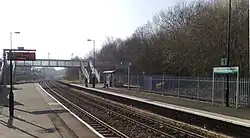 Ruabon station was originally larger than at present, with an extensive marshalling yard with a turntable and goods depot accompanying it, and was the terminus of the Ruabon to Barmouth line which ran via Llangollen, Corwen and Dolgellau.[2] This branch line was a victim of the Beeching cuts in the 1960s, closing to passengers in 1965 and completely three years later.[3] The bay platform serving this route can still be seen at the station, whilst the old goods yard has been redeveloped as a housing estate.