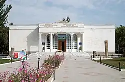 The museum is housed in a specially constructed building in the center of the city.[1] Its facade features two carved panels inspired by the frescoes of ancient Panjakent and displays Rudaki's famous saying: "There is no greater joy in the world than the sight of loved ones and friends".[1] The Rudaki Museum features a central pillared entrance on a white-walled structure, with windows flanking the main door.[4] The architectural style evokes a blend of a summer house and a mausoleum.[4]