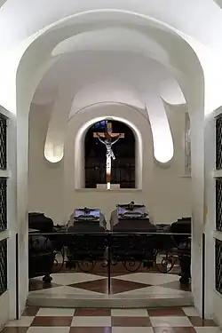 In spite of the high-flying and sometimes megalomaniac character of his plans, he managed to modernize his territories and his city, the prominence of which considerably increased. Rudolf died suddenly at Milan in 1365 aged 25.[1] His and his wife's remains are buried at the Ducal Crypt underneath the Stephansdom in Vienna.[1]