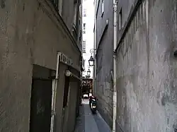 The Rue du Chat-qui-Pêche (French pronunciation: [ʁy dy ʃa ki pɛʃ], lit.'Street of the Fishing Cat') is considered the narrowest street in Paris. It is only 1.80 m (5 ft 11 in) wide for the whole of its 29 m (32 yd; 95 ft 2 in) length.