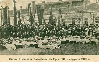 The phrase Ruse blood wedding (Bulgarian: Русенска кървава сватба) usually refers to a 1910 conflict among ethnic groups and the army in Ruse, Bulgaria, resulting in the deaths of 24 people; 70 others were injured. The clashes were caused by the wedding of a Bulgarian man and an ethnic Turkish girl, of which the local Turks disapproved and state authorities violently opposed.