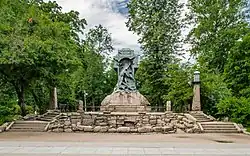 On 23 May [O.S. 10 May] 1911,[6] a monument dedicated to Steregushchiy′s loss in action was opened in Alexander Park on Kamennoostrovsky Prospekt in St. Petersburg in the presence of Emperor Nicholas II. The sculptor Konstantin Vasilievich Isenberg[7] and the architect Aleksandr Ivanovich von Gauguin designed the monument, Professor V. N. Sokolovsky made the calculations for its foundation, and V. Z. Gavrilov cast the sculpture.[8] The monument depicts two sailors – V. Novikov and I. Bukharev – opening Steregushchiy′s Kingston valves to scuttle her and prevent her capture by the Japanese. In May 1911, the Russian magazine Iskra published photographs of the monument's opening ceremony, with a caption under one of them reading "The monument to the heroes of the destroyer 'Steregushchiy' opened on May 10 in St. Petersburg in the Highest Presence with a stream of water pouring from an open porthole."[9]