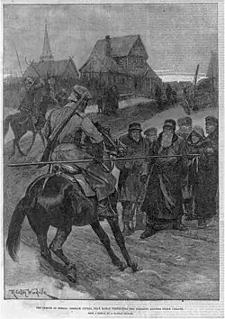 "Cossack patrol near Kazan preventing peasants from leaving their village". Engraving by R. Caton Woodville from sketches. The Illustrated London News, 1892.