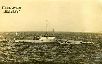 Kaiman was laid down in September 1905 and became the first boat in its class to be launched in December [O.S. November] 1907.[2][6] But completing it and the other three Kaiman class submarines took longer than expected because they were found to have numerous problems. These included not being able to fully submerge, taking 10 minutes to dive, and having a slower maximum speed than what was promised, 10.5 knots (19.4 km/h; 12.1 mph) instead of 15 knots (28 km/h; 17 mph). The Lake Torpedo Boat Company could not fix these issues but wanted the Russian Navy to accept them anyway, which it did, but without paying the final portion of the submarines' total cost of three million rubles. Instead of paying the one million rubles that were still owed, the Ministry of the Navy used those funds to work on the design problems, and they authorized the submarine captains to make any changes to their boats that they deemed necessary. In 1910 all four Kaiman class submarines traveled from the Kronstadt naval base for testing in Finland.[6]