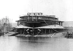 Naval architects of the 1860s tended to increase the beam and reduce the length of their armored ships.[8] This change of the proportions maximized the internal volume protected by the same amount of side armor.[8] It was heralded by Sir Edward James Reed and taken to its extreme by Popov. Popov's coastal battleships Novgorod and Kiev were perfectly circular in plan.[8] The design attempted to circumvent the limitations of the Treaty of Paris, although construction of the Novgorod and the Kiev began when the treaty had been effectively voided by the outcome of the Franco-Prussian War. Popov wrote that a circular shape results in minimal weight of armor belt for a given displacement.[8] It also minimized the draft of the battleships, which was critical for their intended deployment in the estuary of the Dnieper and the Kerch Strait.[8] Their seagoing capacities, on the contrary, were deemed unimportant.[4] The Novgorod and the Kiev were commissioned in 1873 and 1875.[8] The enormous drag of their wide hulls made their engines ineffective[4] and they could make only 8 knots.[2] Their steering was satisfactory against the stream, and entirely unmanageable downstream.[2] Their rudders were ineffective while their outer propellers disturbed the steering[4] yet had no influence on the speed (and were soon removed).[2] And, finally, these ships were too wide to fit into any existing drydock.[9]