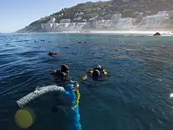 Local divers found the wreck off of Clifton beach in the 1980s but misidentified it as a Dutch merchant ship. Several items from the ship, including bolts, cannon balls and cannons were removed by treasure hunters.[8] Discoveries in archives in South Africa and Portugal, as well as tests of artifacts confirmed in 2015 that the ship was the São José slave ship. On June 3, 2015, along with the formal announcement of the find, a memorial service was held for the lost. Three divers from South Africa, the United States, and Mozambique scattered soil from the slaves' homeland in the surf not far from the wreck. Artifacts from the dive site were displayed at the South Africa's Iziko Museum's Slave Lodge in June 2015, and undergo conservation efforts there, with additional research and recovery continuing.[9][10] Some artifacts were loaned for display at the United States' African American History Museum, when it opened in 2016.[11][12][13][14] Connected with the 2015 anniversary of the abolition of slavery in South Africa and the work on the Sao Jose, the Iziko launched a new website exhibition, Slavery in South Africa.[15]