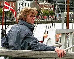 ![]() Søren Ryge Petersen in Dublin preparing a TV documentary about the replica Viking ship Havhingsten fra Glendalough and its six-week-long journey from Roskilde to Dublin in the summer of 2007 | |