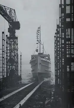 Mona's Queen was launched by Mrs J. Waddington at 9:30am on 12 April 1934 in the presence of G. Clucas (Chairman of the Isle of Man Steam Packet Company), W. Cowley (director), J. Waddington (director), A. Robertson (director) and numerous other representatives of the Company. Amongst those representing the builders were: W. Hichens (Chairman), R. Johnson (managing director) and J. Caird (assistant managing director). Also in attendance were the Lord Mayor and Lady Mayoress of Liverpool and the Mayors of Wallasey, Birkenhead and Bootle. This rather unusual time for the ship's launch was as a consequence of tide conditions in the River Mersey.[5]