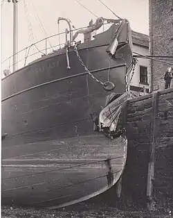 However, the Monarch had also sustained serious damage. Her stem was stoved in, and had it not been for an extra-strong collision bulkhead she may well also of foundered. On discharging the Peveril's crew and passenger, the Monarch moved across the harbour to the Red Pier; and then to the South Quay in order for repairs to be effected, where she attracted considerable attention from the public. A report in the Ramsey Courier; Tuesday, 19 September 1899, stated that the Monarch's bow was covered by canvas in order to obscure the result of the impact, but the entirety could not be fully hidden. Damage could be seen in the shape of a hole, extending several feet below the waterline, as well as damage to her plating stretching back approximately 20 feet, as a consequence of striking the Peveril's belting.[4]