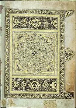 Relatively little is known of Saadian-period art beyond architecture, with the relative exception of decorated manuscripts.[56] Western Maghrebi books, including Qur'ans, had by this point established a calligraphic tradition of writing in the Maghrebi script, which continued well after the medieval (pre-16th century) era.[57] The Saadian sultans were also responsible for compiling large libraries, a practice that became especially marked during the long and prosperous reign of Ahmad al-Mansur. Al-Mansur's increased relations with the Ottoman Empire, particularly during the reign of Mehmed III (1595–1603), resulted in numerous embassies to the Ottoman court which exchanged gifts, including richly produced Qur'an manuscripts. Older manuscripts produced in Al-Andalus were seen as especially dignified gifts and many such examples in the library of Topkapi Palace today may have come from Saadian embassies.[57] In return, the Saadian libraries acquired an even larger number of Ottoman or Middle Eastern manuscripts, some of which remain in Moroccan royal libraries today.[57] Another major and important collection of royal manuscripts, the Zaydani Library, was taken from Sultan Moulay Zaydan by the Spanish in 1612 and has been kept in the library of El Escorial up to the present day.[58][59][57] Among other volumes, it contains a richly produced royal Qur'an dated to 1599, commissioned by Ahmad al-Mansur but known as the Qur'an of Moulay Zaydan (or Koran de Muley Zaidan in Spanish).[60][55]