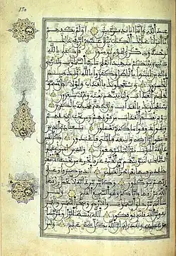 Another richly decorated royal Qur'an, written for Sultan Abdallah al-Ghalib and dated to 1568, is kept by the British Library.[61][56][62] Although the script was written generally in black ink, various orthographic signs (such as vowels and diacritics) were written in red, blue, or orange. Chapter headings were in gold Kufic (a practice widely used in illuminated Qur'an), with the empty spaces between or within letters filled with blue.[61] This multi-colouring practice is widely found in historic Qur'an copies from this region and traces its origins to Abbasid manuscripts.[60] Blue and gold ornamentation, consisting of specific shapes filled with arabesque motifs, is also painted in the margins to mark other divisions in the text: ornate palmettes marked chapter divisions, roundels marked every ten verses, and teardrop shapes marked every five verses. The beginning and end of the manuscript are decorated with illuminated interlacing motifs similar to that seen in some Andalusi examples centuries earlier.[61]