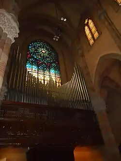 Close to the counter-façade, above a wooden cantoria whose bulwark is decorated with a series of ogival arches, rises the pipe organ, built by Fabbrica Organi Ruffatti after 1960+ in place of a former one, coming from the church of Santa Brigida.[33]