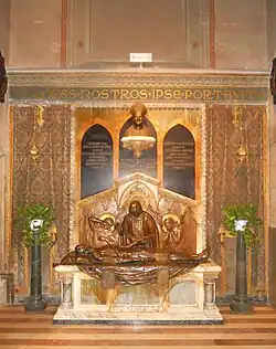The first altar on the right is dedicated to St. Michael Archangel and is surmounted by an altar piece by Alessandro Catani portraying the Saint; the predella shows seven musician Angels, painted by the daughters of the artist.[21] The following altar is dedicated to St. Margaret Mary Alacoque and is surmounted by a triptych by Giovan Battista Conti portraying the Vision of the Heart of Jesus to Margaret Maria Alacoque (1923), while the predella shows, from the left,[22] St. Jeanne-Françoise Frémiot de Chantal, St. Margaret Maria Alacoque surrounded by the souls of the Purgatory, St. Margaret Maria Alacoque shows to the novices the worship of the Sacred Heart of Jesus and St. Francis of Sales.[23]