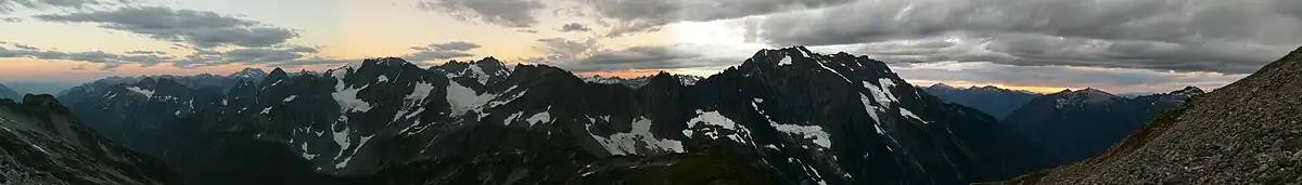 Panoramic view from the top of Sahale Arm at sunset. Summits include Bonanaza Peak, Mount Formidable, The Triplets, and Cascade Peak.