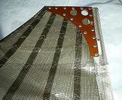 A sail batten is a flexible insert in a fore-and-aft sail that provides added stiffness and definition to the sail's airfoil cross-section.[1] The most common use of sail battens is in the roach of a mainsail. The batten extends the leech past the line that runs from the head and the clew of the sail to create a wider sail towards the top. Cruising sailboats may have four to six battens. Racing sailboats may have full-length battens, as well, that allow for better sail shape.[1] Battens are also found in jibs of beach-cat catamarans.[32] Most battens are fiberglass pultrusions with a thin, rectangular cross section.[1]