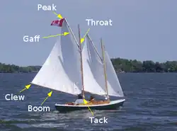 • Throat – On a quadrilateral sail, the throat is the upper forward corner of the sail, at the bottom end of a gaff or other spar.[18] Gaff-rigged sails, and certain similar rigs, employ two halyards to raise the sails: the throat halyard raises the forward, throat end of the gaff, while the peak halyard raises the aft, peak end.[19]