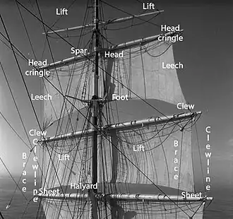 1. ^ a b The traditional terminology is for the two leaches of a square sail to be referred to as the "weather" and "lee", depending on the bracing of the yards, or "port" and "starboard".[10]