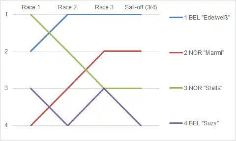 | Rank | Country | Helmsman | Crew | Boat | Race 1 | Race 2 | Race 3 | Race 4 | Total | ||||