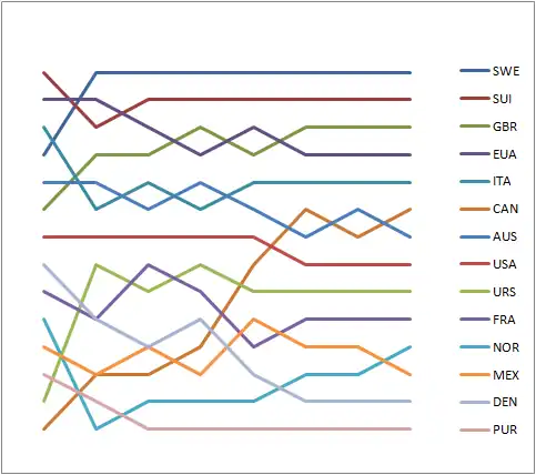 Graph showing the daily standings in the 5.5 Metre during the 1968 Summer Olympics
