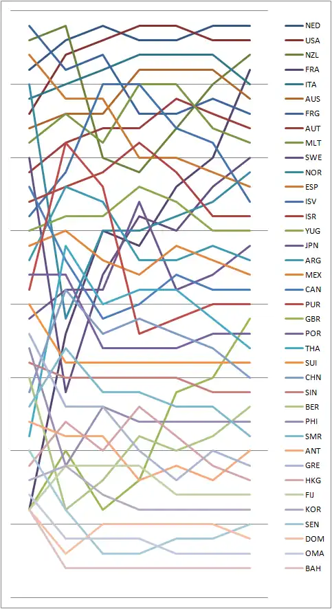 | 36 | 31 | 37.0 | 30 | 36.0 | 33 | 39.0 | 32 | 38.0 | 35 | 41.0 | DSQ | 45.0 | 281.0 | 236.0 | |||