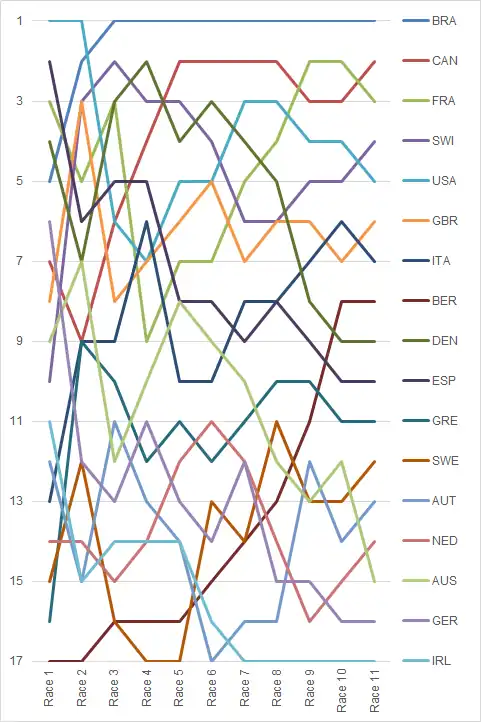 Rank Country Helmsman Crew Race 1 Race 2 Race 3 Race 4 Race 5 Race 6 Race 7 Race 8 Race 9 Race 10 Race 11 Total Total