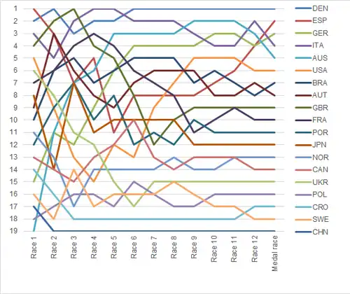 - ^ For the medal race the top ten boats qualified. Each position scored double points. All medal races were sailed on course area Yellow in front of the Qingdao International Sailing Centre.
