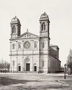 The site chosen for the new church was selected to fit into an intersection of Haussmann's new boulevards. The Boulevard des Invalides and a new boulevard were designed to cross the and to meet the Seine level with the Pont du Carrousel. The new church was intended as the ending point of the new boulevard, though the work was not entirely carried out as intended. The construction was begun under Abbé Jean-Louis Roquette, with architect Adrien Lusson in charge. It was halted for a time in 1861, then resumed by architect Joseph Uchard.[1]