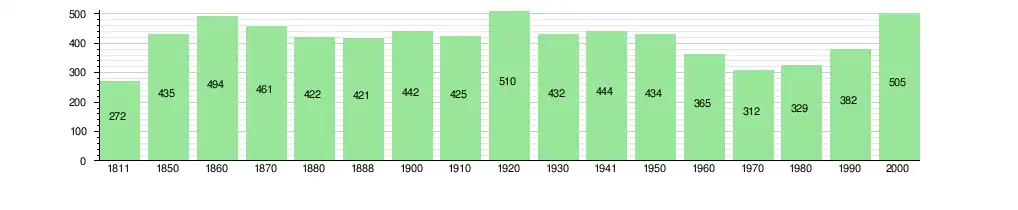 Saint-Martin has a population (as of December 2018) of 1,005.[7] As of 2008, 5.9% of the population are resident foreign nationals.[8] Over the last 10 years (2000–2010), the population has changed at a rate of 11.3%. Migration accounted for 9.5%, while births and deaths accounted for 3.2%.[9] Most of the population (as of 2000) speaks French (468 or 92.7%) as their first language. Albanian is the second most commonly spoken language (13 or 2.6%), and German is the third (12 or 2.4%). There is 1 person who speaks Italian.[10]