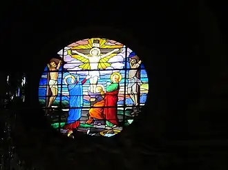 The Chapel of the Virgin or Chapel de Messe, built in 1971, makes a striking contrast to the more traditional nave. It is extremely modern in design, in the style of the 1970s, with right angles predominant. Its decoration includes vine=like abstract sculpture creeping along the walls, and very vivid modern stained glass windows in abstract geometric forms.