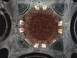 St. Gevorg has a single large Byzantine-style red tile, octagonal umbrella dome that is centered over the church. The style of domed roof is uncommon in Armenia, especially on larger structures. The dome sits above an octagonal drum that is pierced by twelve small windows; pairs of windows on each of the four sides, and single windows on the other four sides. The church was renovated at least once.[1]