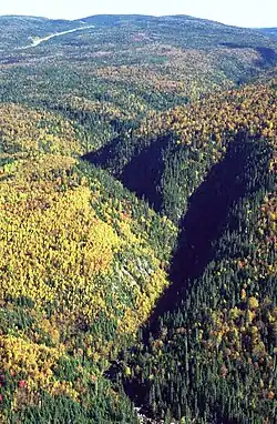 • "Le Grand rapide", located at north-west of the "Montagne de Bardsville" (337 metres (1,106 ft)); in front, on north side of the river, the "Mont Arthur-Leblanc" is topping the sector at 465 metres (1,526 ft);