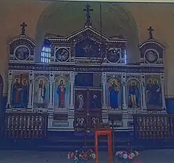 The iconostasis in the church in Sosnowica dates back to the 19th century and consists of 15 icons arranged in two rows.[2] The lower row contains 10 icons, including four on the royal doors. From the left, these depict St. Helena and St. Constantine, St. Stephen, the Mother of God, Christ Pantocrator, St. Michael the Archangel, and the church's patrons, Saints Peter and Paul. The upper row features four icons: The Last Supper, The Nativity of the Mother of God, The Dormition of the Mother of God, and The Resurrection of Christ. The icon of the Last Supper was transferred from the iconostasis of the previous church in Sosnowica.[3] The entire iconostasis follows the Russian ecclesiastical art style of the second half of the 19th century.[2] Additionally, side icon cases in the church display icons of St. Vladimir and St. Olga, as well as Saints Cyril and Methodius.[3] These icon cases were donated to the local parish by the future saint, John of Kronstadt.[9]