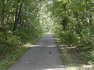 Sakatah Singing Hills State Trail is a 41-mile-long (66 km) paved multi-use rail trail connecting Faribault and Mankato, Minnesota. It is maintained by the Minnesota Department of Natural Resources, which converted it from a railroad line. The name derives from the Dakota people who lived in the region; "Sakatah" translates into "singing hills". It began as a snowmobile trail and is now shared by hikers, joggers and cross-country skiers. There are sections of parallel dirt trail for horseback riders but they are not continuous. The landscape is mostly cultivated land with remnant stands of prairie and Big Woods. The trail passes through Sakatah Lake State Park and runs through city streets in Waterville.