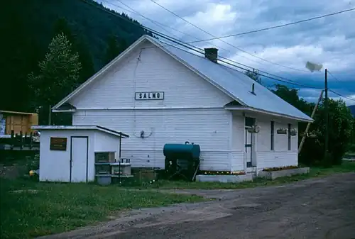 West Kootenay Power and Light brought electricity in 1931. Incorporated as a village in 1946, Salmo benefits from passing tourists.[7] On the western perimeter, at the Sal-crest Motel, is the word's oldest phone booth (1977).[9] On the northwest side of the highway downtown, the former N&SF combination station/freight shed (a designated heritage building) stands on the Salmo-Troup Rail Trail. This building dates from 1913,[10] a replacement after the Great Northern Railway (GN) relocated the original to Northport, Washington, over a dispute with the local council.[7] Farther along at the information board is the world's largest penny (1995).[9]