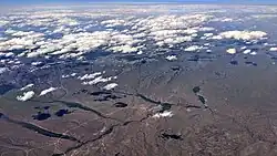 Spread across approximately 2,103 square miles (5,450 km2) with 871 square miles (2,260 km2) in the state of Idaho, the Salmon Falls Creek basin drains portions of Elko County in Nevada and Owyhee and Twin Falls County in Idaho. Much of the southern portion of the watershed is part of the Basin and Range Province of northern Nevada, while the lower watershed is characterized by the basalt plateau of the Snake River Plain.[6] As a whole, the entire Salmon Falls Creek watershed is very arid. Much of the basin receives less than 10 inches (25 cm) of rain annually, while the mountainous areas may get up to 30 inches (76 cm). Rainfall in the mountains provides most of the perennial flow into Salmon Falls Creek Reservoir, while springs from the Snake River Aquifer also provide some water.[7]