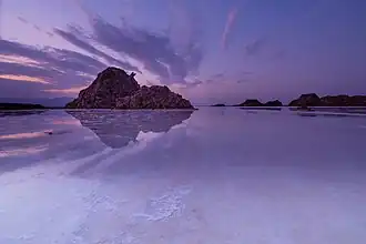 A salt lake or saline lake is a landlocked body of water that has a concentration of salts (typically sodium chloride) and other dissolved minerals significantly higher than most lakes (often defined as at least three grams of salt per liter).[1] In some cases, salt lakes have a higher concentration of salt than sea water; such lakes can also be termed hypersaline lake, and may also be pink lakes on account of their color. An alkalic salt lake that has a high content of carbonate is sometimes termed a soda lake.[2]