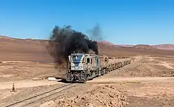 Due to a presence of mineral deposits in the Atacama area, most traffic on the line consists of freight trains transporting minerals such as lithium carbonate, borax, butane, pearlite, salt, ulexite, and brine.[12] The most famous service is the sightseeing Tren a las Nubes (train to the clouds), running between Salta and La Polvorilla. Nowadays, apart from some suburban trains running from Salta to Campo Quijano, the Tren a las Nubes is the only passenger train serving the line, after the cancellation of the Tren Mixto Salta-Socompa,[13] that once linked Socompa with Tucumán and Buenos Aires (Retiro Station), via Córdoba and Rosario.[14] The Chilean part of the line, also served only by freight trains, was the site of a proposed commuter rail line on the route running through Antofagasta.[15]