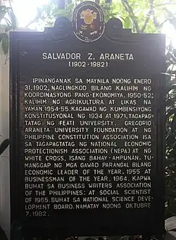 Historical marker installed by the National Historical Institute to commemorate Salvador Araneta