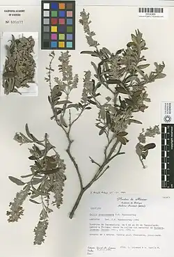 Salvia anastomosans is a branching shrub up to 2 m (80 inches) tall. Much of the shoot is covered with small branching hairs. Leaf blades are narrowly oblong, up to 4 cm (1.6 inches) long. Flowers are borne in racemes in the axils of the leaves and at the tips of the branches, with the flowers in clumps at the nodes. The calyx appears white because of the dense covering of branched hairs. Corolla is blue. The species epithet "anastomosans" refers to the unusual anastamosing nature of the veins in the leaf, forming an interconnecting network rather than having each vein end abruptly without connecting with another.[2]