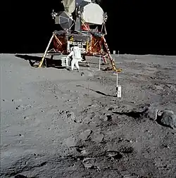 1. ^ The Apollo 12 astronauts removed several components from Surveyor 3, including the television camera, and returned them to Earth, where they are treated as lunar samples by NASA. It returned about 10 kilograms (22 lb) of the Surveyor 3's original landing mass of 302 kilograms (666 lb) to Earth to study the effects of long term exposure. Surveyor 3 is the only probe visited by humans on another world.