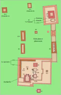The residential area has not yet been well studied. The investigations and excavations in San Andrés have been primarily of the political-ceremonial center and have revealed that it was divided into the South Seat (from which they governed) and the North Seat. In the year 600 AD, the South Seat was filled with adobe (leaving a tunnel leading to the original seat) to construct the Acropolis, which contains ceremonial and political structures. In the ends to the South and East of the Acropolis are pyramids or structures: 1 (the main pyramid), 2, 3 and 4. In the North ends and the west are a series of rooms where the governors lived (the last palaces of San Andrés) of which two have been reconstructed. To the south of the Acropolis lies structure 7, another ceremonial structure. In the North seat, or Great Seat, is the pyramid or structure 5 (called "La Campana" - the bell) which is united with the Acropolis behind structure 6 (which has the shape of an L). Around structure 5 are the structures where commerce took place.