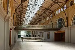 With the restoration however, the developers argued that the public's historic interaction with the space was defined by the natural light cascading from the nave, not by the elevated entry way. With the movement of the primary public space to the first floor, it became essential to their proposal that this historic experience would be recreated.[18] Beyond removing an added third floor and restoring the 660-foot-long (200 m) nave to its two-story height, the proposal included cutting two openings, each at 33 by 150 feet (10 by 46 m), into the floor of the second level. These openings would allow for this historic feature to be extended to the visitor's experience of the first floor. This was a controversial choice, and due to the building's historic status, the proposal had to be approved by the State Historic Preservation Office (SHPO); this was the subject of multiple hearings.[19]