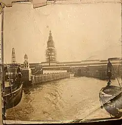 Opened on July 13, 1898, the building replaced a wooden predecessor constructed on the same site in 1875. The well built reinforced building with its arched arcades survived both the 1906 and the 1989 earthquakes with little damage. It served as the destination for commuters to San Francisco from the East Bay, who rode the ferry fleets of the Southern Pacific and the Key System. It also served as the connection to San Francisco for the transcontinental rail lines of the Southern Pacific, Santa Fe and Western Pacific which terminated in Oakland, and for the Northwestern Pacific running north from Marin County. The ferry piers north of the clock tower served the Key System, Santa Fe, and Northwestern Pacific, while the piers south of the tower served the Southern Pacific and Western Pacific.[4] Streetcars were initially served on Market Street with a turntable utilized for reversing cars.[5] Following the 1906 earthquake, a two-track balloon loop was installed in front of the building to enable convenient transfers to streetcars. When the Twin Peaks Tunnel began carrying streetcars in 1918, a third loop was added. This layout was capable of handling up to 295 cars per hour.[6] A large pedestrian bridge spanned the Embarcadero in front of the Ferry building to facilitate safe crossing of the busy plaza and transit hub. In the 1940s, the bridge was dismantled to supply scrap metal for the Second World War.