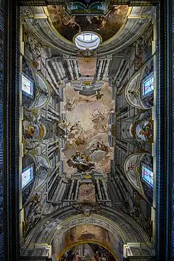The Oratory houses the Confraternity Standard painted by Giovanni Francesco Romanelli. The standard represents the Baptism of Christ and the Madonna of Mercy (1649). The wooden choir stalls created by Carlantonio Morini (1833–34). On the walls above these, painted by Pietro Piazza and his compatriot Giuseppe Rosa are a series of monochrome scenes portraying episodes from the life of the Baptist. From the left we can see the Angel and Zachariah, John in the desert, God summoning John to his mission, John reproaching Herod, the Lamb of God, the Decapitation of John the Baptist. The spandrels and the ceilings of the apse were frescoed by Giuseppe Rosa in 1747. The ceiling depicts the Birth of the Baptist attributed to Pietro Orlandi, and the lunettes depict the Sermon of St John. A 17th-century canvas derived from the church of San Silvestro depicts the Death of St Anne. ( XVII century).[3]