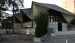 In its architecture, the church was conceived as a 'tent church'.[19] It features twelve stained glass windows, created between 1986 and 1992, which illustrate the seven sacraments, the birth of the Church, and Christ's incarnation, passion, death and resurrection. The current presbytery was added between 1999 and 2000.[7]