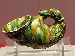 Sancai (Chinese: 三彩; pinyin: sāncǎi; lit. 'three colours')[1] is a versatile type of decoration on Chinese pottery and other painted pieces using glazes or slip, predominantly in the three colours of brown (or amber), green, and a creamy off-white. It is particularly associated with the Tang dynasty (618–907) and its tomb figures,[1] appearing around 700.[2] Therefore, it is commonly referred to as Chinese: 唐三彩 Tang Sancai in Chinese. Tang sancai wares were sometimes referred in China and the West as egg-and-spinach by dealers, for their use of green, yellow, and white, especially when combined with a streaked effect.[3]